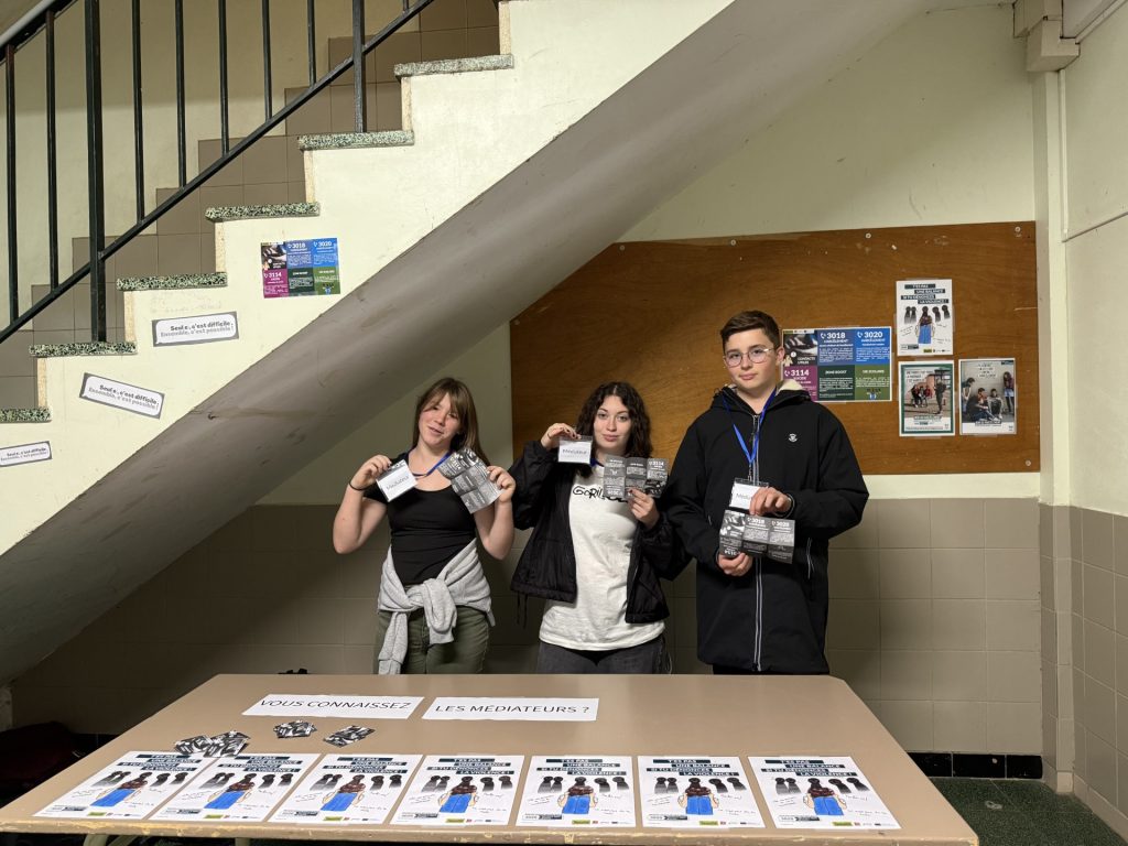 Les médiateurs ont également distribué des flyers répertoriant les contacts utiles et les numéros d’écoute pour venir en aide aux élèves victimes ou témoins de harcèlement.